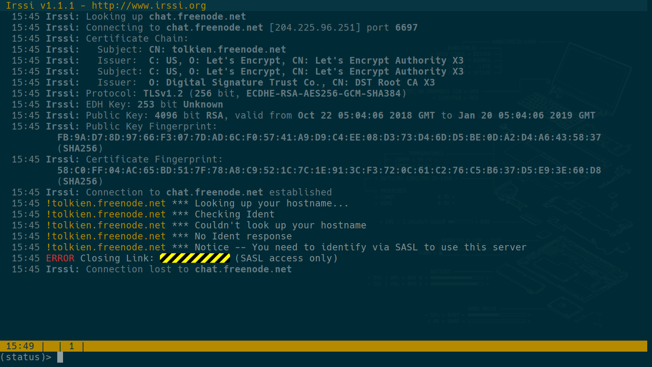 Selanjutnya, buka Irssi dan kita akan disconnect lalu memasukkan SSL sertifikasi pada konfigurasi untuk terhubung ke server Freenode.